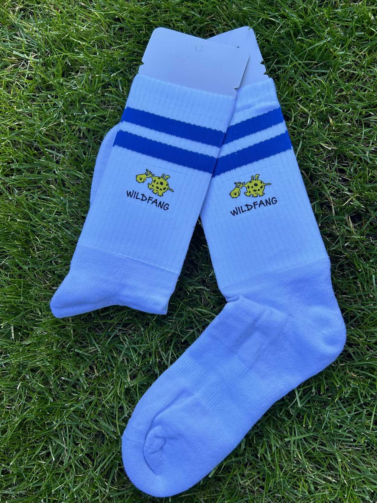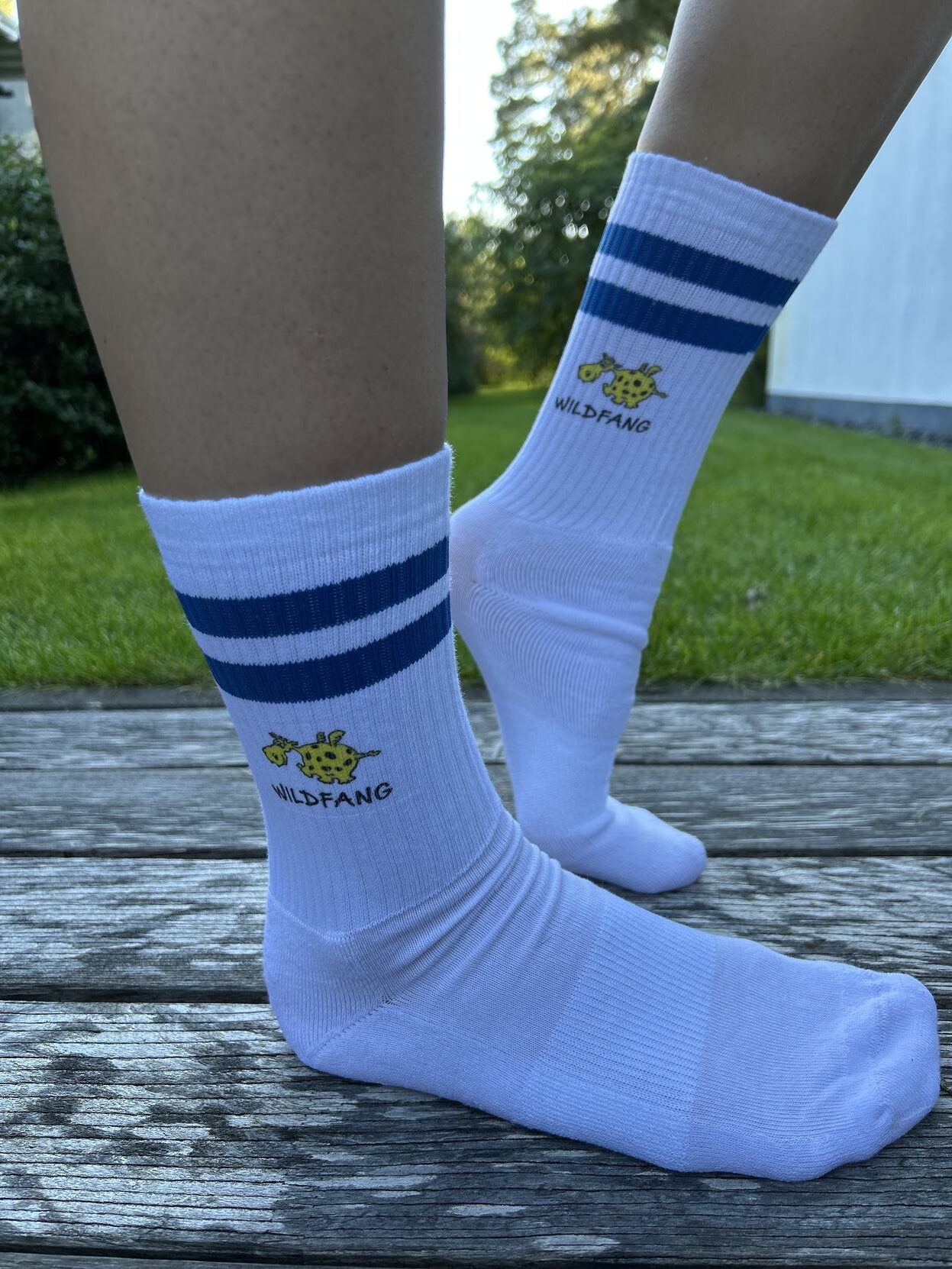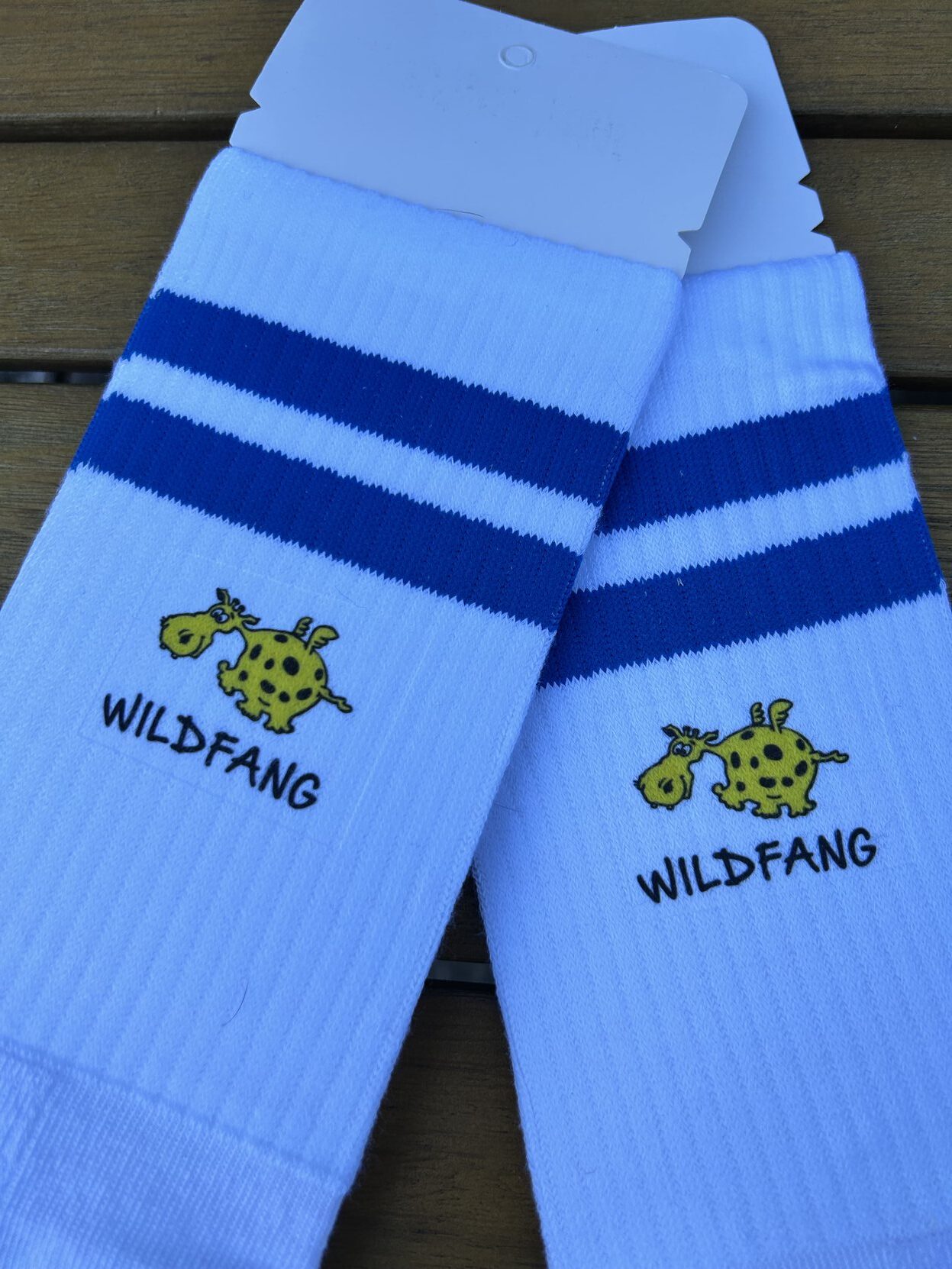 Die stylishen Wildfang-Socken kommen mit blauen Streifen und Kuhlumbus-Logo.